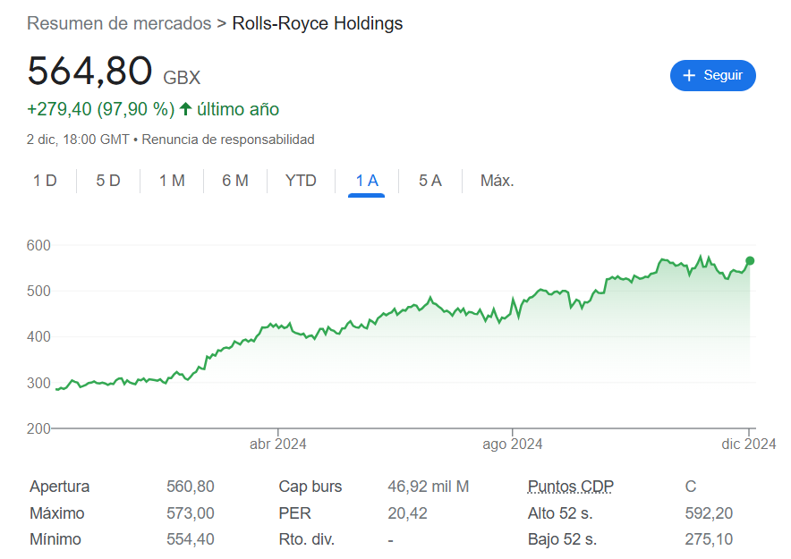 Bolsa: las acciones de Rolls-Royce han tenido un comportamiento espectacular: su valoración se ha multiplicado x 4 en los últimos dos años, reflejando la confianza de los inversores en su estrategia y liderazgo.